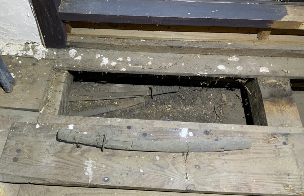 2階の物置の床の一部を剥がしたら、泥とホコリまみれの「刀」が2本。錆びて使い物にならないでしょうが、本物です。剥がした床の板は釘でしっかりと止められていたので、いざという時に戦えるよう、刀を隠していたのでしょう。